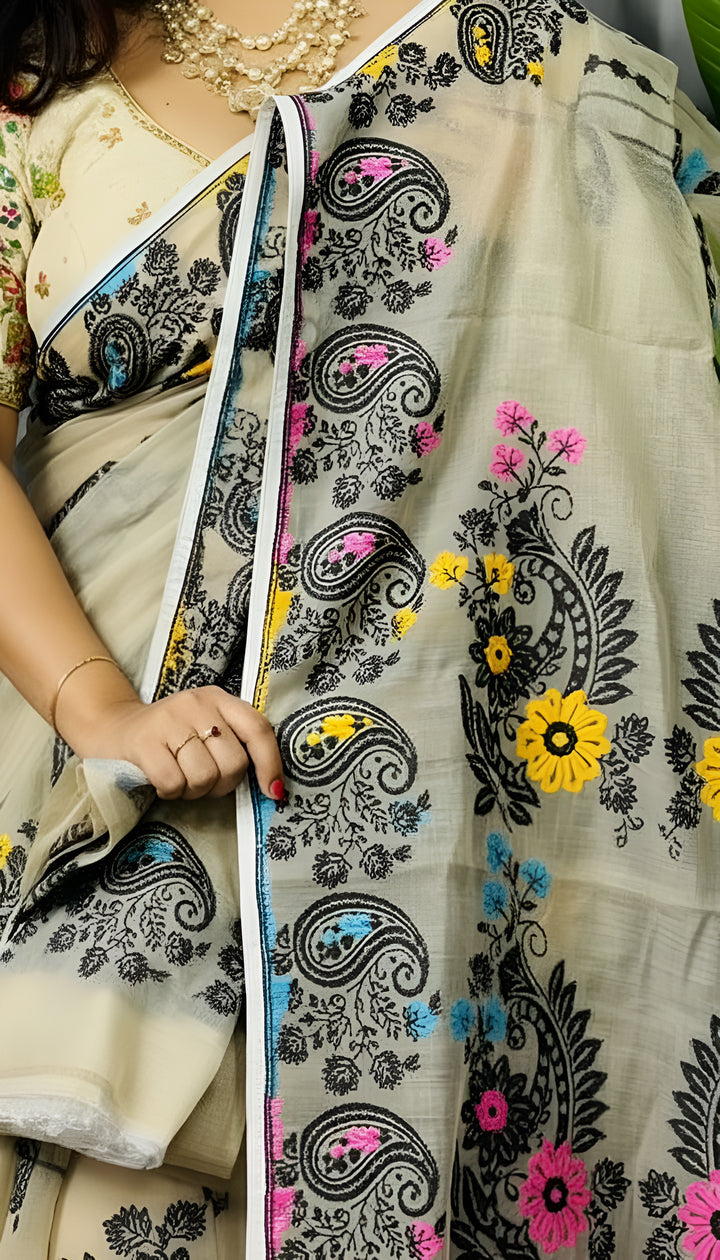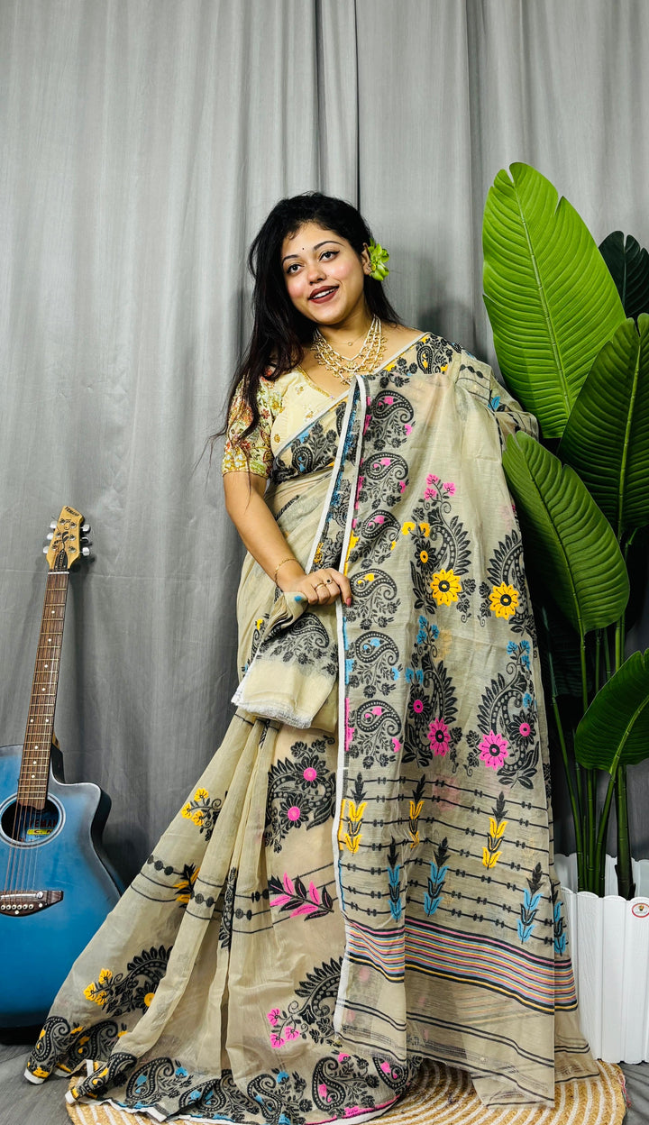 Bring home timeless elegance with this Beige Color Black Embroidered Dhakai Jamdani Saree with Blouse Piece, a masterpiece that beautifully blends tradition with sophistication. Handwoven by skilled artisans, this saree showcases the rich heritage of Dhakai Jamdani weaving, making it a prized addition to every woman’s ethnic wardrobe. Crafted from premium soft cotton, this saree ensures unmatched comfort while maintaining a graceful drape. The soothing beige base offers an elegant canvas for the intricate black embroidered buti work, delicately woven across the fabric. Each motif reflects the finesse and craftsmanship of traditional Bengal weaving, making every saree truly unique. The contrasting black embroidery adds a striking appeal, enhancing the saree’s overall look without overpowering its subtle charm. The design is further complemented by a matching blouse piece, allowing you to style it effortlessly for any occasion. Whether you’re attending a festive gathering, cultural event, or a light celebration, this saree ensures you radiate understated grace and poise. This Dhakai Jamdani saree is more than just an outfit—it’s a symbol of cultural artistry. The handloom weaving technique, known for its lightweight texture and exquisite patterns, makes this saree breathable and comfortable for all-day wear. Its traditional woven buti motifs in contrasting shades of black create a perfect blend of classic aesthetics and modern sophistication. Pair this beige and black embroidered saree with silver or oxidized jewelry, and minimal makeup to let the saree’s craftsmanship take center stage. Whether styled for a daytime function or an evening get-together, this saree effortlessly enhances your traditional charm. Perfect for festivals like Durga Puja, Diwali, Eid, or weddings, the Beige Color Dhakai Jamdani Saree stands as a versatile choice for women who appreciate the beauty of handcrafted Indian textiles. The intricate weaving, elegant color combination, and lightweight comfort make it suitable for both casual and semi-formal occasions. Each piece celebrates the legacy of handloom artistry from Bengal, ensuring that you don’t just wear a saree—but carry forward a tradition woven with care, patience, and love. The soft cotton texture adds a breathable finish, keeping you cool and comfortable even during long events or warm weather. Elevate your ethnic collection with this Beige Color Black Embroidered Dhakai Jamdani Saree with Blouse Piece, and embrace the timeless beauty of Indian craftsmanship. It’s not just fashion—it’s heritage redefined for the modern woman. ?? SEO Keywords Optimized in Description: Beige color Dhakai Jamdani saree Black embroidered Jamdani saree Handloom cotton saree for women Traditional Bengali Jamdani saree Soft cotton embroidered saree Dhakai Jamdani saree with blouse piece Buti work Jamdani saree Festive wear cotton saree