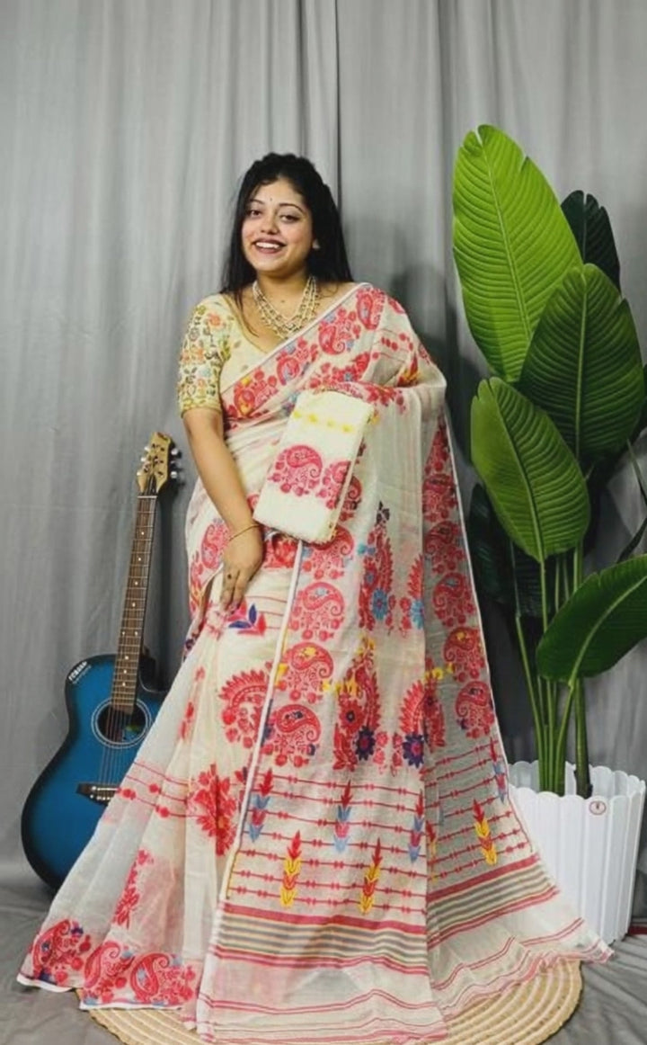 Beige color yellow & red embroidered dhakai jamdani saree with bp