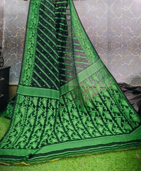 Traditional Cotton Jamdani saree in classic shade is versatile and comfortable. Grace up your lighter occasions by pairing it with minimal accessories. Saree is finished with alluring butis woven all over. Soft Cotton Handloom with traditional woven buti work in contrasting colours is befitting for the upcoming Festive season .