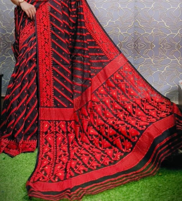 Traditional Cotton Jamdani saree in classic shade is versatile and comfortable. Grace up your lighter occasions by pairing it with minimal accessories. Saree is finished with alluring butis woven all over. Soft Cotton Handloom with traditional woven buti work in contrasting colours is befitting for the upcoming Festive season .