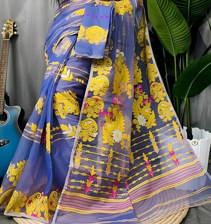 Blue color yellow & pink embroidered dhakai jamdani saree with bp