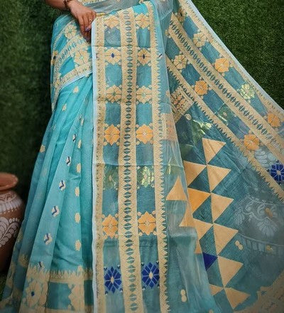 Traditional Cotton Dhakai Jamdani saree in classic shade is versatile and comfortable. Grace up your lighter occasions by pairing it with minimal accessories. Saree is finished with alluring butis woven all over. Soft Cotton Handloom with traditional woven buti work in contrasting colours is befitting for the upcoming Festive season .