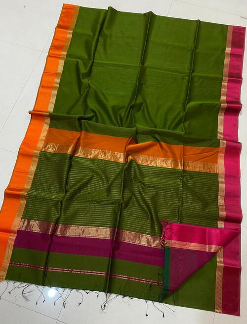 Maheshwari Saree-with fine cotton yarns in its weft and silk in the warp, is a light and breezy fabric and has a soft silky lustre. The most interesting part of a Maheshwari saree is the pallu. Gold thread or Silver zari is also used in Maheshwari sarees to weave elegant motifs on the body, border and Pallu. .A must have for your wardrobe this wedding or festive season. .Comes with a blouse piece.