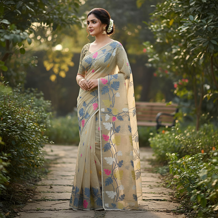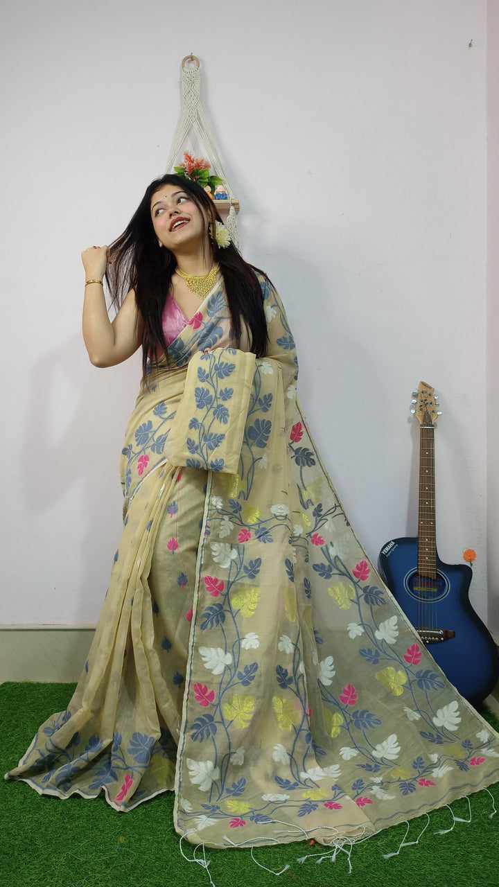 Radiate grace and tradition with this Light Yellow Base Multi-Color Embroidered Dhakai Jamdani Saree with Blouse Piece, a timeless handloom masterpiece that beautifully captures the essence of Bengal’s rich weaving heritage. Handcrafted with passion and precision, this saree embodies elegance, comfort, and the unmatched artistry of traditional Dhakai Jamdani weaving. Made from premium-quality soft cotton handloom fabric, this saree ensures a luxurious feel and effortless drape. The soothing light yellow base symbolizes warmth, optimism, and joy — a perfect reflection of festive spirit. The saree is adorned with multi-color embroidered butis intricately woven throughout, creating a harmonious contrast that enhances its charm and sophistication. Each motif tells a story of craftsmanship, patience, and legacy passed down through generations of skilled artisans. Ideal for festivals, pujas, family functions, and cultural gatherings, this Dhakai Jamdani saree offers the perfect balance between tradition and modernity. Its lightweight texture makes it easy to carry and comfortable to wear throughout the day, while the intricate embroidery adds a festive vibrance that’s perfect for any celebration. Whether you’re attending a daytime event or an evening function, this saree ensures you stand out with subtle elegance. The saree comes with a matching unstitched blouse piece, allowing you to personalize your look. Pair it with delicate jewelry and a sleek bun for a traditional touch, or add contemporary accessories and soft curls for a modern festive appeal. Each Dhakai Jamdani saree is meticulously handwoven using age-old techniques that involve interlacing threads on traditional looms, creating intricate patterns that appear to float on the fabric. This handloom artistry makes every saree unique — a wearable piece of heritage. Owning a Jamdani saree is not just about style; it’s a celebration of India’s sustainable craftsmanship and cultural pride. ?? Key Features: Fabric: 100% Pure Cotton Handloom Color: Light Yellow Base with Multi-Color Embroidered Butis Weaving Style: Traditional Dhakai Jamdani Weave Design: All-over Buti Patterns with Contrasting Thread Embroidery Blouse Piece: Included (Unstitched) Texture: Lightweight, Soft & Breathable Occasion: Suitable for Festivals, Pujas, Parties & Cultural Events Care Instructions: Gentle hand wash separately in cold water; dry in shade ?? Why You’ll Love It: This Light Yellow Dhakai Jamdani Saree with Multi-Color Embroidery is perfect for women who appreciate handcrafted luxury and timeless beauty. The pastel hue complements every skin tone, while the vibrant woven motifs add a cheerful and graceful touch. It drapes beautifully, offering comfort and poise — making it ideal for long festive hours. Celebrate the charm of traditional weaving with this multi-color embroidered light yellow Dhakai Jamdani saree, a symbol of elegance, artistry, and cultural heritage. Perfect for gifting or adding to your personal collection, this saree is a must-have for every woman who cherishes authentic handloom fashion. Embrace heritage, comfort, and style — all in one stunning drape that speaks of grace and grandeur.
