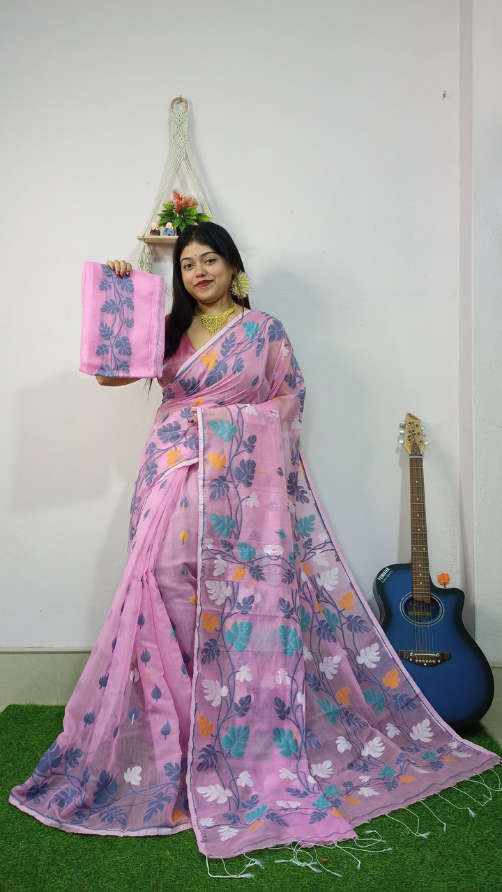 Bring home the timeless charm of Bengal’s weaving tradition with this Pink Color Firozi & Yellow Embroidered Dhakai Jamdani Saree with Blouse Piece — a masterpiece that perfectly balances elegance, craftsmanship, and comfort. Handwoven with precision by skilled artisans, this saree reflects the grace and richness of traditional Dhakai Jamdani art, renowned for its intricate motifs and lightweight texture. This exquisite pink base saree features beautifully embroidered Firozi and yellow butis spread gracefully across the body, adding a vibrant and festive charm. The delicate interplay of colors makes it an ideal choice for both traditional and semi-formal occasions. Crafted from premium soft cotton handloom fabric, this saree ensures maximum comfort and breathability, making it suitable for all-day wear, even in warmer weather. The highlight of this saree lies in its traditional woven buti design, which represents centuries-old Jamdani weaving artistry. Each motif is handwoven meticulously, symbolizing the dedication of the weaver and the cultural heritage of Bengal’s textile legacy. The contrasting firozi and yellow embroidery enhances its appeal, giving the saree a regal yet contemporary touch that suits modern tastes while retaining ethnic authenticity. Paired with a matching blouse piece, this saree offers you the freedom to design your own blouse style — be it traditional, minimalist, or trendy. Accessorize it with oxidized silver jewelry or delicate gold ornaments to create an effortlessly graceful festive look. Whether it’s a family gathering, cultural event, puja, or festive celebration, this saree is designed to make you stand out elegantly. The lightweight cotton fabric ensures that you feel at ease throughout the day, while the smooth texture drapes beautifully around the body, accentuating your natural grace. It’s a perfect example of how handloom craftsmanship meets modern-day comfort — a must-have addition to your ethnic collection. Each Dhakai Jamdani saree is a labor of love — taking days or even weeks to complete. By choosing this saree, you support traditional artisans and help preserve the centuries-old weaving art form that defines the heritage of Bengal. ? Key Features: Color: Elegant Pink base with Firozi & Yellow Embroidery Fabric: Premium Soft Cotton Handloom Design: Traditional woven buti work with embroidered motifs Blouse Piece: Included (unstitched) Texture: Lightweight, breathable, and comfortable Suitable For: Festive occasions, cultural events, or casual ethnic wear Care Instructions: Dry clean or gentle hand wash recommended ?? Why You’ll Love It: Handwoven by skilled artisans using authentic Dhakai Jamdani techniques Perfect balance of tradition, elegance, and comfort Vibrant contrasting embroidery enhances visual appeal Ideal for both festive occasions and daily ethnic wear Embrace the allure of heritage with this Pink Dhakai Jamdani Saree with Firozi & Yellow Embroidery — a piece that celebrates the spirit of Indian craftsmanship and timeless elegance.