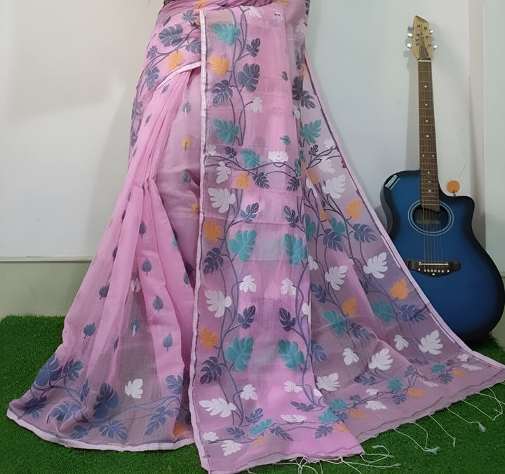 Dhakai Jamdani Pink Base Multi Color Embroidered Saree With Bp