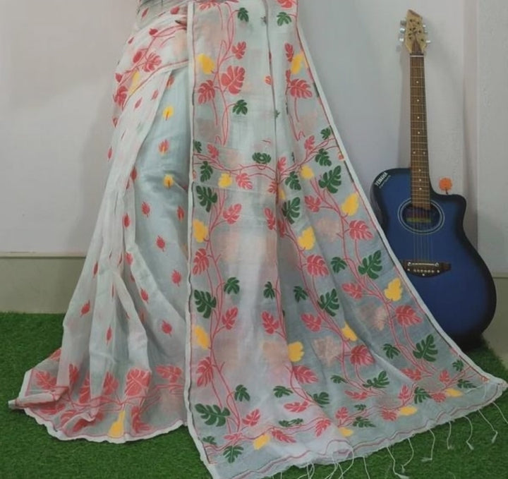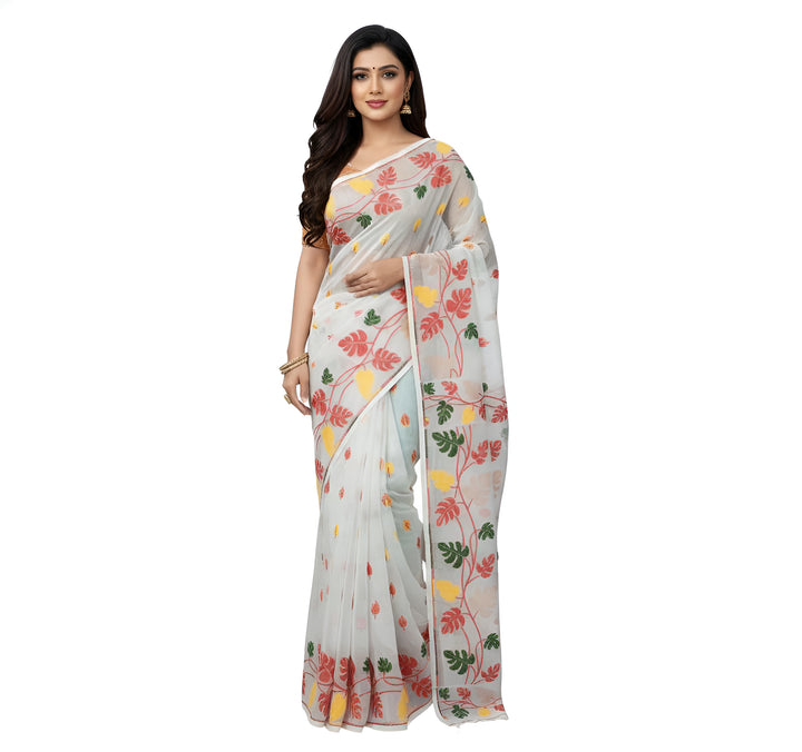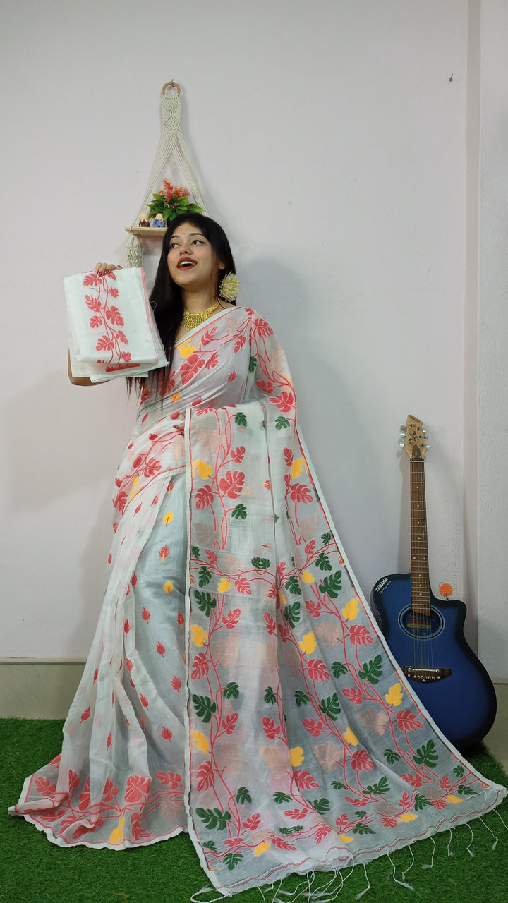 Elevate your ethnic wardrobe with this exquisite White Base Multi-Color Embroidered Dhakai Jamdani Saree with Blouse Piece, a perfect fusion of timeless artistry and modern elegance. Crafted from premium-quality soft cotton handloom fabric, this saree showcases the unmatched craftsmanship of traditional Dhakai Jamdani weaving, known for its intricate patterns, airy texture, and luxurious comfort. The pristine white base exudes purity and grace, while the multi-color embroidered butis woven delicately across the saree add a vibrant, festive charm. Each motif is meticulously designed to reflect the rich heritage of Bengal’s Jamdani weaving tradition, making this saree a piece of wearable art. The contrasting hues of the embroidery lend it a refreshing, youthful appeal, perfect for both traditional and contemporary looks. This Dhakai Jamdani saree is a versatile addition to your collection — light in weight yet rich in elegance. Its breathable cotton texture ensures all-day comfort, making it ideal for warm climates and long festive events. The saree comes paired with a matching blouse piece, allowing you to customize your ensemble with modern or classic tailoring. Whether it’s a family gathering, religious celebration, or cultural event, this saree perfectly balances sophistication and simplicity. Pair it with traditional jewelry and a sleek bun for a regal appearance, or style it with minimal accessories and loose waves for an effortlessly chic daytime look. What makes this saree truly special is its handcrafted nature — each piece is woven by skilled artisans using age-old techniques passed down through generations. Owning a Dhakai Jamdani saree is not just about fashion; it’s about celebrating India’s rich textile heritage and supporting sustainable, artisan-led craftsmanship. ? Key Features: Fabric: 100% Pure Cotton Handloom Color: Elegant White Base with Multi-Color Embroidery Weaving Style: Authentic Dhakai Jamdani Weave Design: Traditional Buti Patterns with Intricate Embroidery Blouse Piece: Included (Unstitched) Texture: Lightweight, Soft, and Breathable Occasion: Ideal for Festivals, Family Functions, and Cultural Events Care Instructions: Gentle hand wash in cold water; dry in shade ?? Why You’ll Love It: This white cotton Dhakai Jamdani saree is perfect for women who appreciate understated luxury and traditional charm. Its combination of a pure handwoven base and vibrant threadwork makes it a standout choice for every season. The saree drapes gracefully, offering both comfort and elegance — a hallmark of authentic Jamdani craftsmanship. Add this multi-color embroidered white Dhakai Jamdani saree to your ethnic wear collection and experience the timeless beauty of Bengal’s handloom legacy. A must-have for saree enthusiasts, it embodies grace, tradition, and artistry — everything a modern woman desires in a saree.