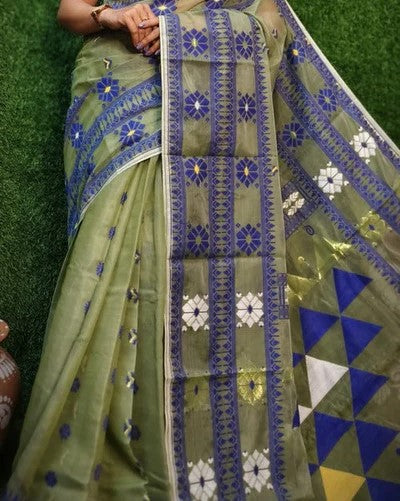 Traditional Cotton Dhakai Jamdani saree in classic shade is versatile and comfortable. Grace up your lighter occasions by pairing it with minimal accessories. Saree is finished with alluring butis woven all over. Soft Cotton Handloom with traditional woven buti work in contrasting colours is befitting for the upcoming Festive season .