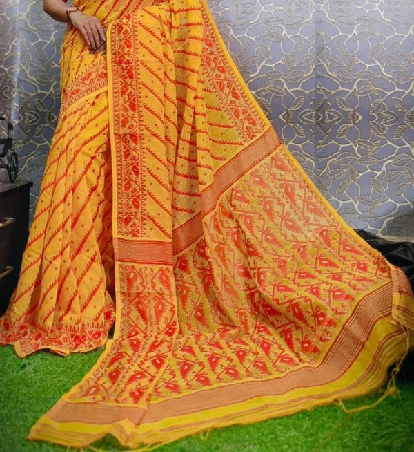 Traditional Cotton Jamdani saree in classic shade is versatile and comfortable. Grace up your lighter occasions by pairing it with minimal accessories. Saree is finished with alluring butis woven all over. Soft Cotton Handloom with traditional woven buti work in contrasting colours is befitting for the upcoming Festive season .