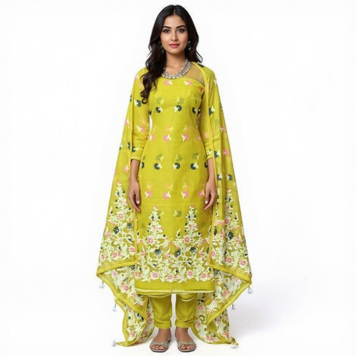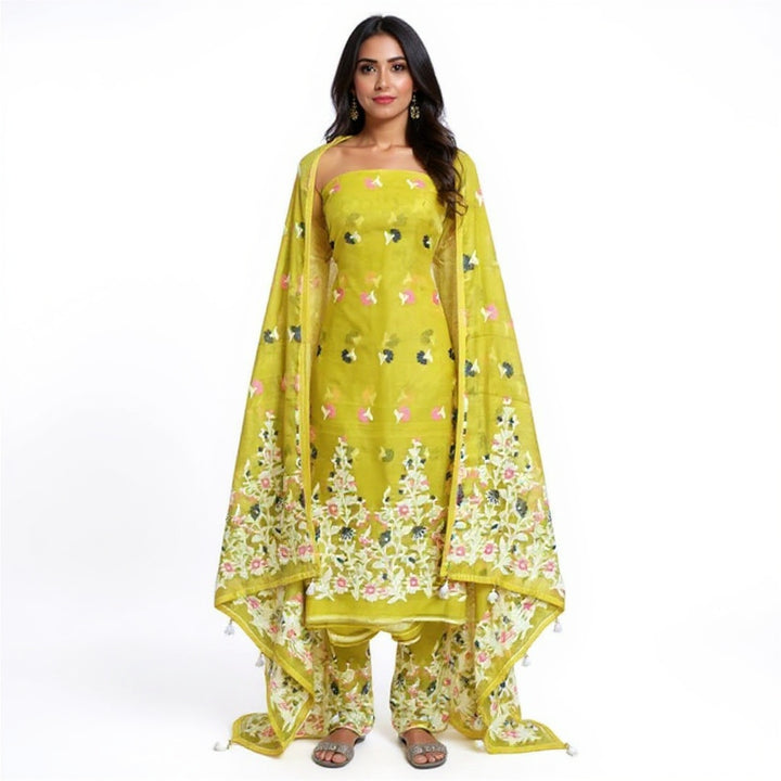Embrace the elegance and tradition of Bengal with our Olive Color Dhakai Jamdani 2pcs Suit Set. This exquisite ensemble is handwoven by skilled artisans, showcasing the intricate artistry of Jamdani weaving—a heritage craft celebrated for its delicate motifs and rich history. Made from pure cotton, the fabric is lightweight, breathable, and perfect for comfortable all-day wear. The set includes a generous 2.5-meter length of premium Dhakai Jamdani fabric, intricately woven with patterns that blend traditional and contemporary designs. The sophisticated olive color adds a touch of elegance, making it suitable for various occasions, from festive celebrations to casual gatherings. Each suit set comes with a matching dupatta, completing the ensemble and enhancing its overall appeal. The dupatta features complementary patterns, adding an extra layer of refinement to the outfit. Whether you're attending a family function, cultural event, or simply looking to elevate your everyday style, this Jamdani suit set ensures you stand out with its timeless beauty and graceful charm. Jamdani weaving is a meticulous process where each motif is handwoven into the fabric, reflecting the dedication and skill of the weavers. This Dhakai Jamdani suit set is not just a piece of clothing but a work of art that celebrates the rich textile heritage of Bengal. Key Features: Handwoven Dhakai Jamdani fabric from Bengal Pure cotton material, 2.5 meters in length Intricate and elegant patterns Matching dupatta included Sophisticated olive color for an elegant look Blends traditional and contemporary designs Suitable for various occasions Our Olive Color Dhakai Jamdani 2pcs Suit Set is perfect for those who appreciate the beauty of traditional Indian textiles. The timeless design and superior craftsmanship make it a valuable addition to your wardrobe. Whether you're looking for a unique outfit for a special occasion or a beautiful gift for a loved one, this Jamdani suit set is sure to impress. Choose this Olive Color Dhakai Jamdani 2pcs Suit Set and experience the allure of handcrafted elegance. Each piece reflects the rich cultural heritage of Bengal and the artistry of our weavers. Order now and add a touch of heritage and style to your collection.