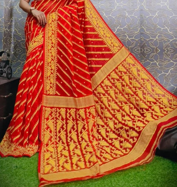 Traditional Cotton Jamdani saree in classic shade is versatile and comfortable. Grace up your lighter occasions by pairing it with minimal accessories. Saree is finished with alluring butis woven all over. Soft Cotton Handloom with traditional woven buti work in contrasting colours is befitting for the upcoming Festive season .