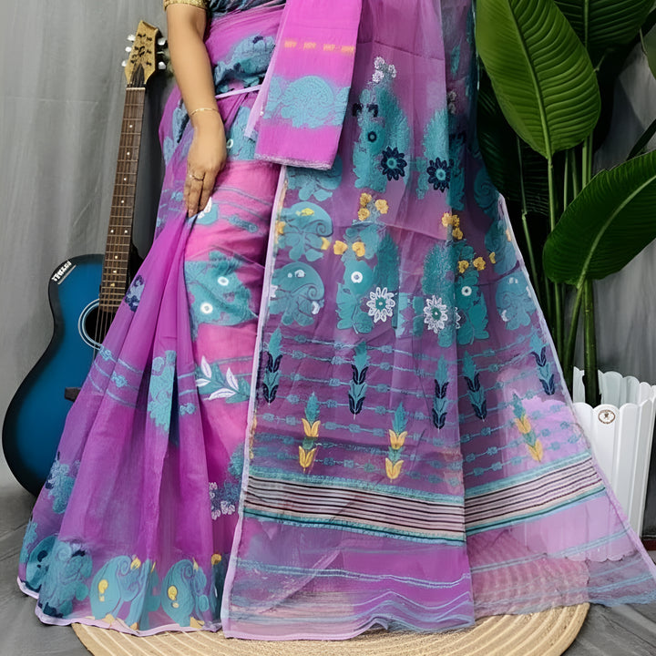Bring home the timeless charm of Bengal’s weaving tradition with this Pink Color Firozi & Yellow Embroidered Dhakai Jamdani Saree with Blouse Piece — a masterpiece that perfectly balances elegance, craftsmanship, and comfort. Handwoven with precision by skilled artisans, this saree reflects the grace and richness of traditional Dhakai Jamdani art, renowned for its intricate motifs and lightweight texture. This exquisite pink base saree features beautifully embroidered Firozi and yellow butis spread gracefully across the body, adding a vibrant and festive charm. The delicate interplay of colors makes it an ideal choice for both traditional and semi-formal occasions. Crafted from premium soft cotton handloom fabric, this saree ensures maximum comfort and breathability, making it suitable for all-day wear, even in warmer weather. The highlight of this saree lies in its traditional woven buti design, which represents centuries-old Jamdani weaving artistry. Each motif is handwoven meticulously, symbolizing the dedication of the weaver and the cultural heritage of Bengal’s textile legacy. The contrasting firozi and yellow embroidery enhances its appeal, giving the saree a regal yet contemporary touch that suits modern tastes while retaining ethnic authenticity. Paired with a matching blouse piece, this saree offers you the freedom to design your own blouse style — be it traditional, minimalist, or trendy. Accessorize it with oxidized silver jewelry or delicate gold ornaments to create an effortlessly graceful festive look. Whether it’s a family gathering, cultural event, puja, or festive celebration, this saree is designed to make you stand out elegantly. The lightweight cotton fabric ensures that you feel at ease throughout the day, while the smooth texture drapes beautifully around the body, accentuating your natural grace. It’s a perfect example of how handloom craftsmanship meets modern-day comfort — a must-have addition to your ethnic collection. Each Dhakai Jamdani saree is a labor of love — taking days or even weeks to complete. By choosing this saree, you support traditional artisans and help preserve the centuries-old weaving art form that defines the heritage of Bengal. ? Key Features: Color: Elegant Pink base with Firozi & Yellow Embroidery Fabric: Premium Soft Cotton Handloom Design: Traditional woven buti work with embroidered motifs Blouse Piece: Included (unstitched) Texture: Lightweight, breathable, and comfortable Suitable For: Festive occasions, cultural events, or casual ethnic wear Care Instructions: Dry clean or gentle hand wash recommended ?? Why You’ll Love It: Handwoven by skilled artisans using authentic Dhakai Jamdani techniques Perfect balance of tradition, elegance, and comfort Vibrant contrasting embroidery enhances visual appeal Ideal for both festive occasions and daily ethnic wear Embrace the allure of heritage with this Pink Dhakai Jamdani Saree with Firozi & Yellow Embroidery — a piece that celebrates the spirit of Indian craftsmanship and timeless elegance.