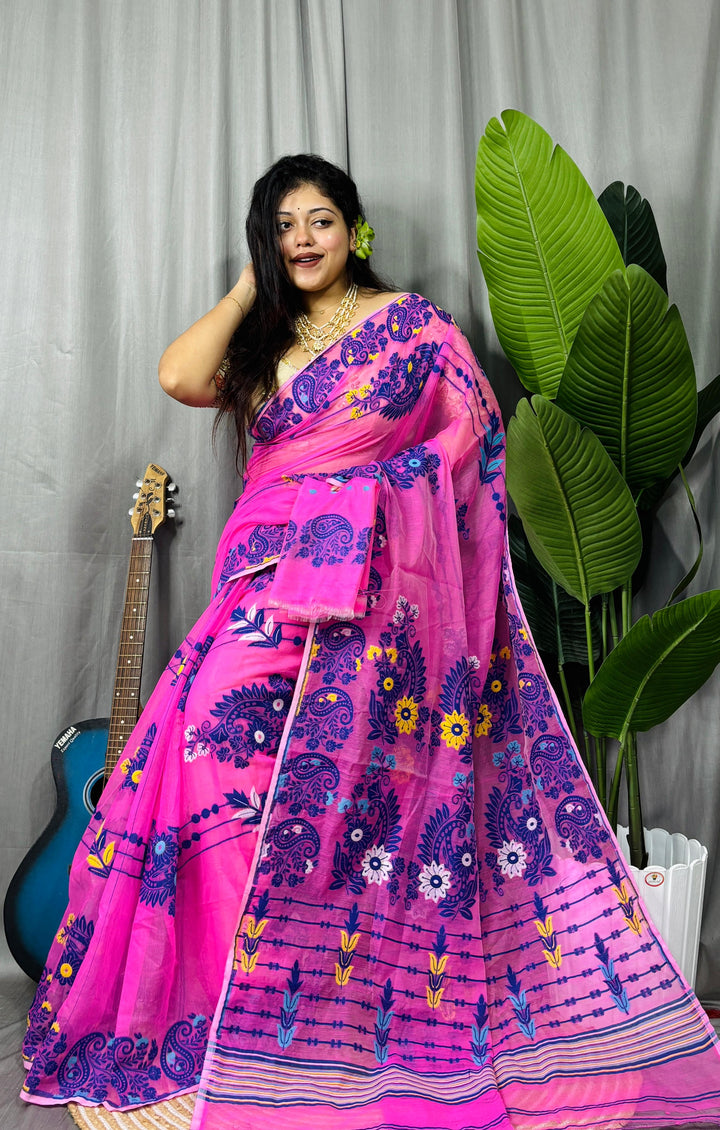 Pink color purple & yellow embroidered dhakai jamdani saree with bp