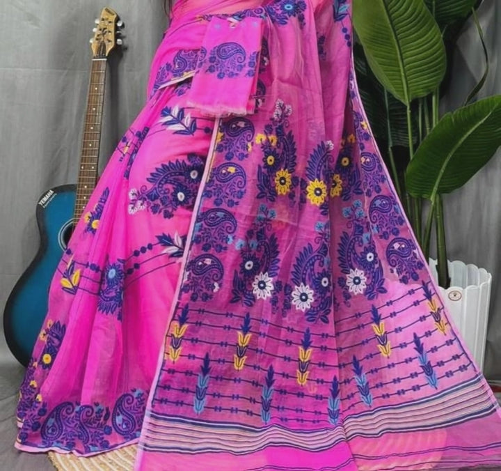 Radiate timeless grace and feminine charm with this Pink Color Purple & Yellow Embroidered Dhakai Jamdani Saree with Blouse Piece, a stunning creation that perfectly captures the essence of traditional Indian craftsmanship. Handwoven with care and precision, this saree showcases the enduring beauty of Bengal’s Dhakai Jamdani weaving, blending artistry, heritage, and elegance into one exquisite ensemble. Crafted from soft and breathable cotton, this saree offers both comfort and sophistication. The vibrant pink base color exudes joy and warmth, while the intricate purple and yellow embroidered buti motifs add a playful yet elegant contrast. Each thread is meticulously woven by skilled artisans, reflecting the legacy of handloom craftsmanship that has been passed down through generations. The saree’s delicate design features traditional Jamdani motifs spread gracefully across the body, lending it an aura of refined luxury. The beautifully woven pallu and border highlight a harmonious interplay of purple and yellow embroidery, creating an eye-catching look that remains effortlessly graceful. Paired with a matching blouse piece, it offers endless styling possibilities for festive gatherings, weddings, and cultural celebrations. This Dhakai Jamdani saree is known for its feather-light texture, making it ideal for all-day wear during warm weather or long occasions. Its handloom cotton fabric drapes beautifully, ensuring a comfortable and flattering fit for women of all ages. Whether you’re dressing up for a daytime puja, family celebration, or an elegant evening event, this saree strikes the perfect balance between tradition and modernity. Style this pink, purple, and yellow embroidered Jamdani saree with traditional jewelry—think oxidized silver, gold jhumkas, or pearl accessories—to enhance its ethnic charm. Complete your look with a neat bun, bindi, and subtle makeup for an effortlessly graceful appearance that turns heads wherever you go. Beyond its visual beauty, this saree is a tribute to India’s rich textile heritage. The Dhakai Jamdani weaving technique is one of the most revered art forms, celebrated for its intricate detailing and labor-intensive craftsmanship. By choosing this saree, you are not just embracing a beautiful outfit but also supporting the legacy of skilled artisans who continue to keep this age-old tradition alive. The Pink Color Purple & Yellow Embroidered Dhakai Jamdani Saree with Blouse Piece is a must-have addition to your ethnic wardrobe. Perfect for festive seasons like Diwali, Durga Puja, Navratri, or family functions, this saree embodies elegance, comfort, and tradition in every fold. It’s an ideal choice for women who appreciate the beauty of handloom textiles and love to make a graceful statement at every occasion. Celebrate your individuality and the timeless charm of Indian handloom artistry with this exquisite Jamdani creation — where every weave tells a story of culture, craftsmanship, and elegance. ?? SEO Keywords Optimized in Description: Pink color Dhakai Jamdani saree Purple and yellow embroidered Jamdani saree Handloom cotton saree for women Traditional Dhakai Jamdani saree Soft cotton embroidered saree Dhakai Jamdani saree with blouse piece Festive wear cotton saree Buti work Jamdani saree