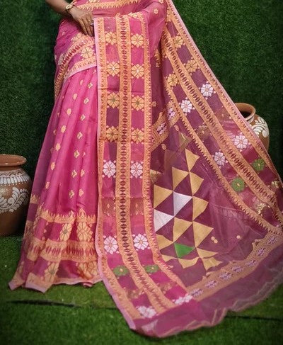 Traditional Cotton Dhakai Jamdani saree in classic shade is versatile and comfortable. Grace up your lighter occasions by pairing it with minimal accessories. Saree is finished with alluring butis woven all over. Soft Cotton Handloom with traditional woven buti work in contrasting colours is befitting for the upcoming Festive season .