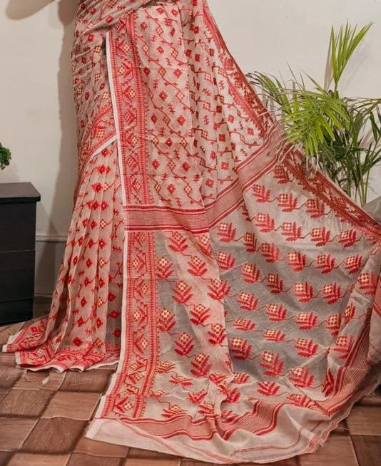 Pure Cotton Peach Color Jamdani work all over Saree
