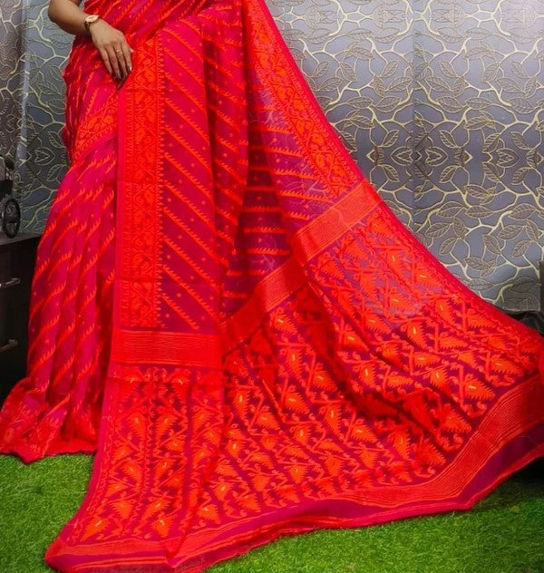 Traditional Cotton Jamdani saree in classic shade is versatile and comfortable. Grace up your lighter occasions by pairing it with minimal accessories. Saree is finished with alluring butis woven all over. Soft Cotton Handloom with traditional woven buti work in contrasting colours is befitting for the upcoming Festive season .