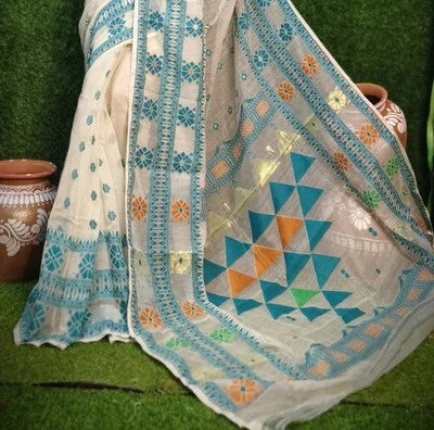 Traditional Cotton Dhakai Jamdani saree in classic shade is versatile and comfortable. Grace up your lighter occasions by pairing it with minimal accessories. Saree is finished with alluring butis woven all over. Soft Cotton Handloom with traditional woven buti work in contrasting colours is befitting for the upcoming Festive season .