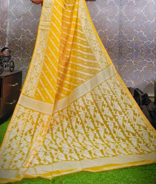Traditional Cotton Jamdani saree in classic shade is versatile and comfortable. Grace up your lighter occasions by pairing it with minimal accessories. Saree is finished with alluring butis woven all over. Soft Cotton Handloom with traditional woven buti work in contrasting colours is befitting for the upcoming Festive season .